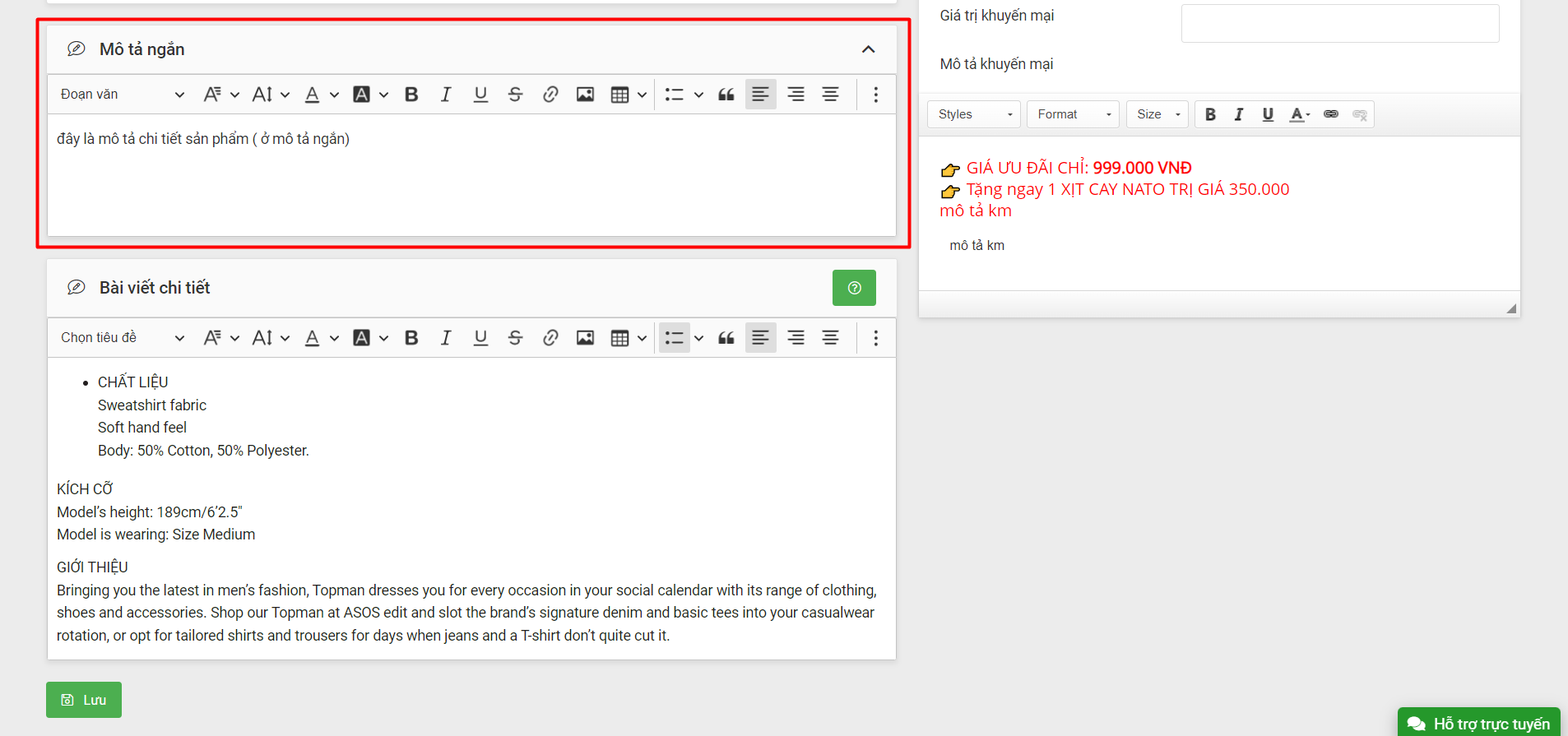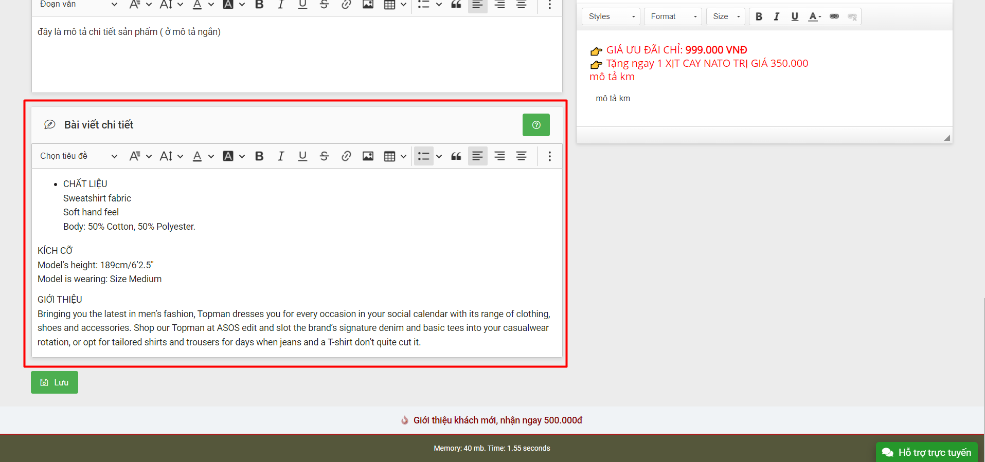 Chi tiết sản phẩm là phần bài viết chi tiết của sản phẩm sẽ được thêm trong trang quản trị của khách hàng.